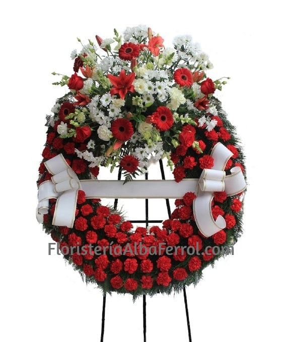 Sobria y elegante Corona Funeraria Estándar, realizada con un aro de 70-80 cm con una cantidad de 90 a 100 claveles de color rojo y salpicada de verdes que le dan un encanto especial. Está adornada con un cabezal de flores para defunción en la parte superior de flores variadas en blanco y rojo: 4 lilium, 4 rosas, 10 varas de margaritas, lisianthus, 6 antirrinhum, claveles y verdes variados. Esta Corona de flores para tanatorio está realizada siempre con flores para tanatorio y de primerísima calidad. Nos las suministran a diario, tanto proveedores nacionales, como internacionales. Somos floristas profesionales y especialistas en el arte funerario. Por lo cual, si quiere enviar flores al tanatorio, nuestras coronas de flores para dar condolencias son siempre extraordinarios.